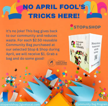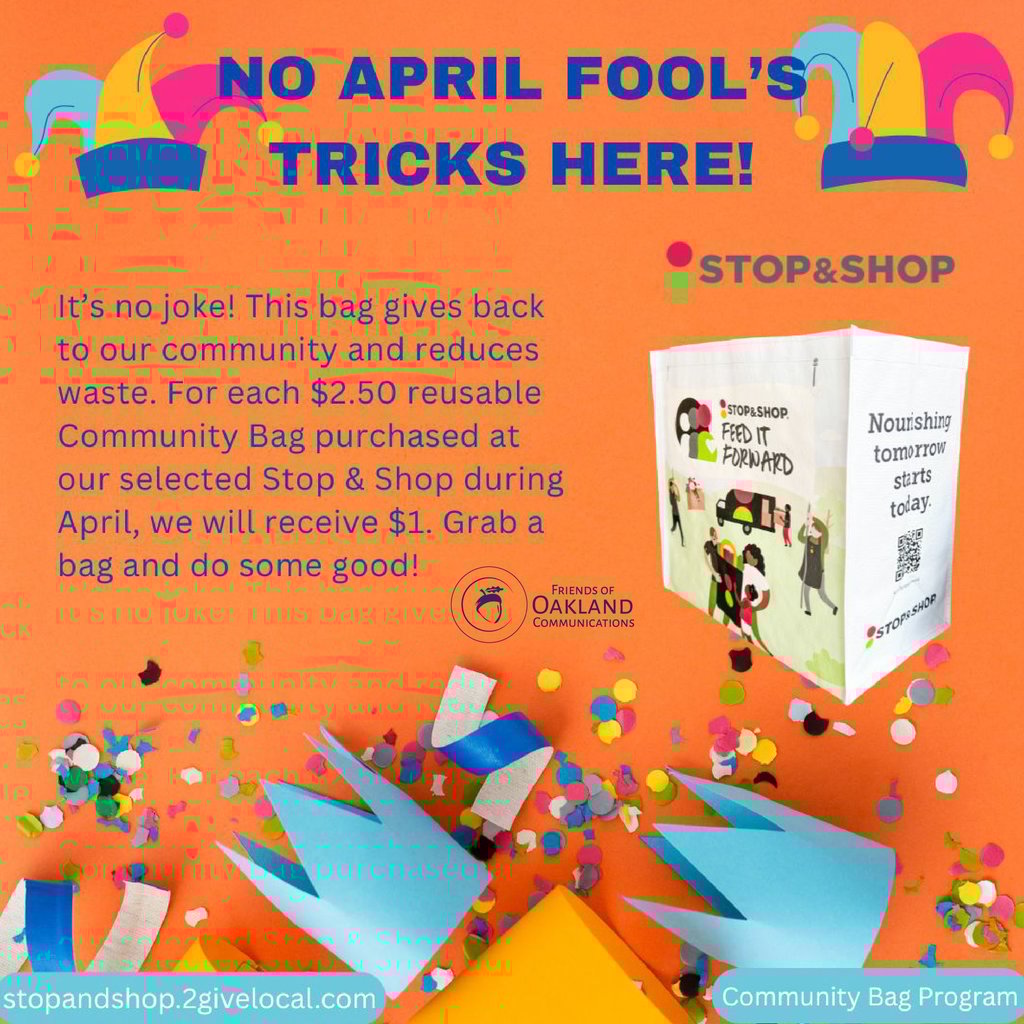 Throughout the month of April, each time you purchase a $2.50 reusable community bag at the Stop & Shop located at 816 Franklin Ave, Franklin Lakes, NJ, we will receive a $1 donation. The funds raised will go directly to the Oakland Communications Commission, helping us carry out vital work in our community.